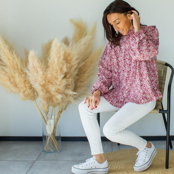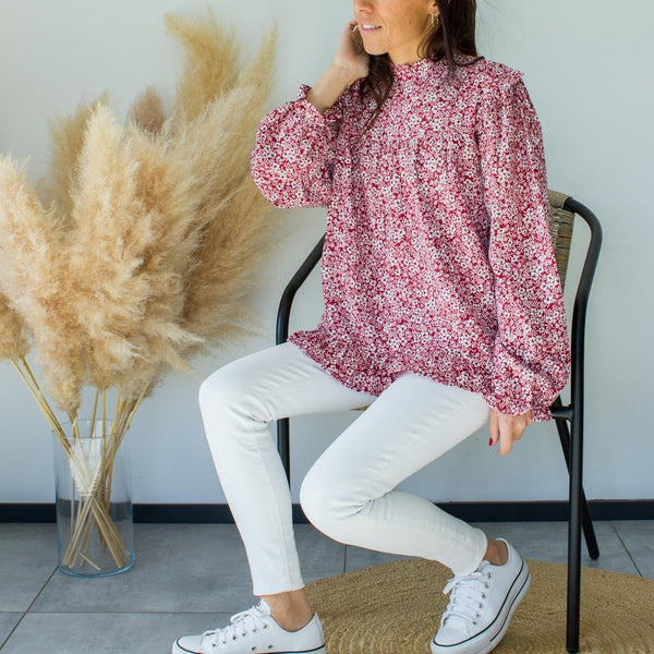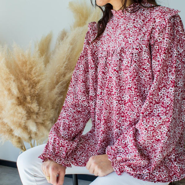 Blouse avec motifs fleuris blanc et noir sur fond bordeaux